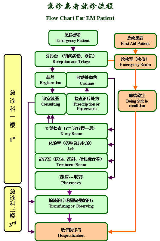 ⒉来诊患者请先到分诊台登记、预诊及填写病历,分诊台北侧收费处挂号;分诊护士会据病情分级决定就诊次序,通知医生看病人。为最大限度保障病患者的生命安全,医院实行危重症抢救优先的原则,普通急诊遇有一定的等候时间请予理解和配合。