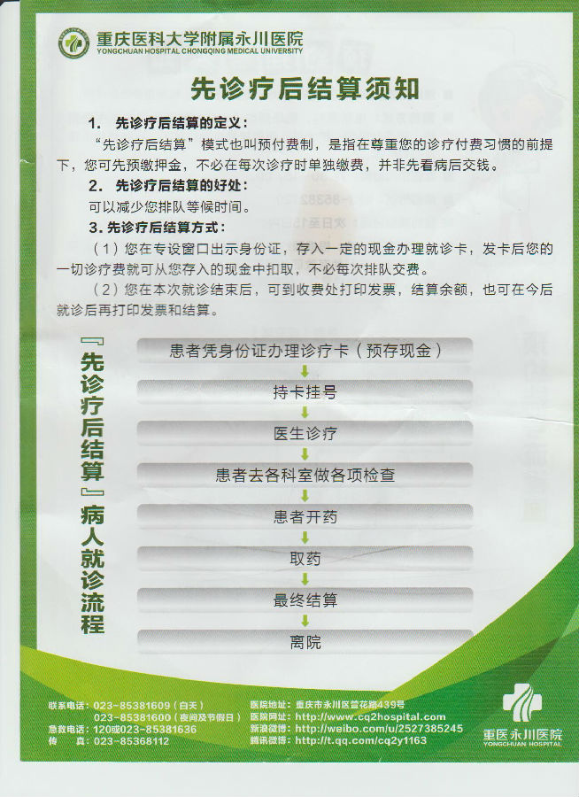 重庆医科大学附属永川医院诊疗费用结算流程和须知