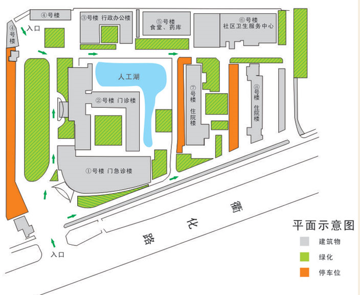 1号楼(门急诊楼): 一楼 急诊(内、外、骨)科 输液室 放射科 CT室 核磁共振