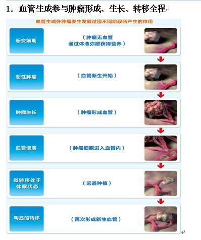 l 肿瘤生长的血管依赖性为所有肿瘤共性,即使血液系统的非实体性肿瘤,如急性淋巴细胞性白血病等,在骨髓中也有大量新生血管的形成。因此,针对肿瘤血管治疗策略具有抗瘤的“广谱性”,适合不同肿瘤的治疗。